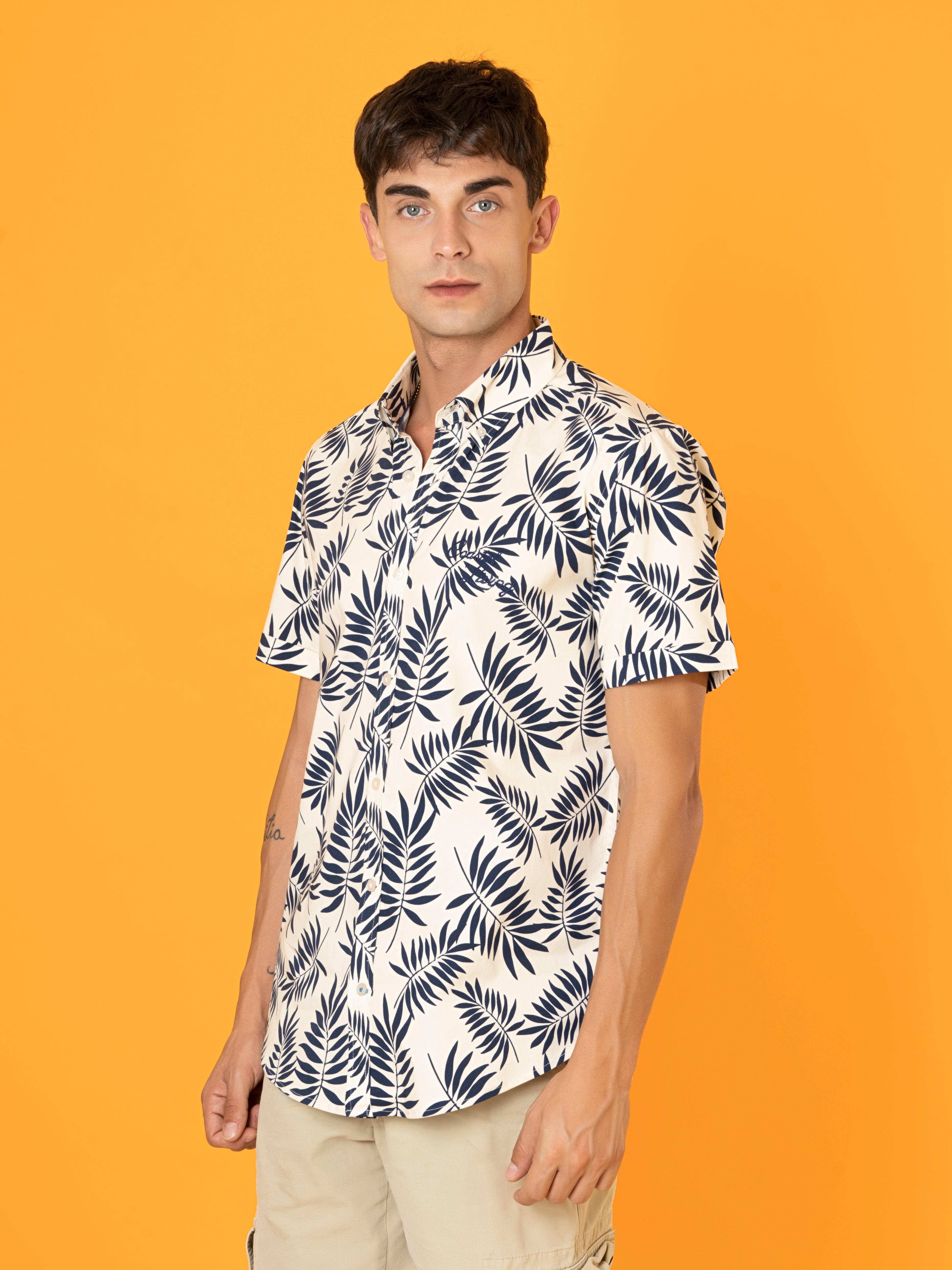 -A bold printed short sleeve shirt.
